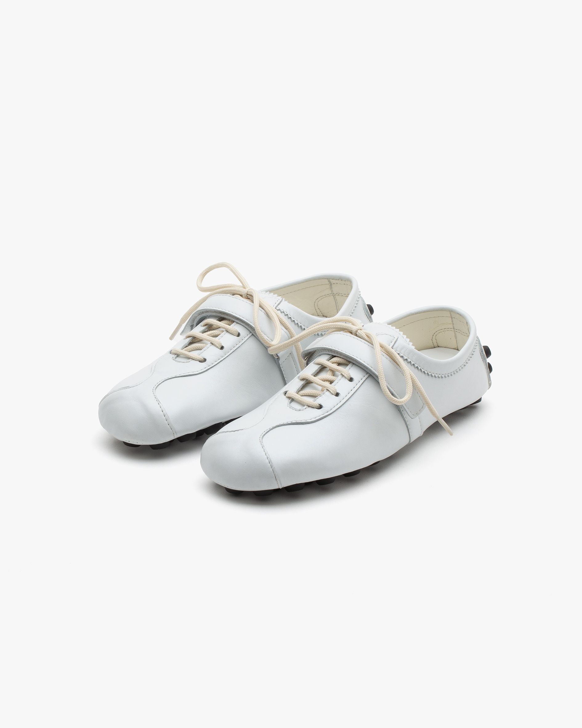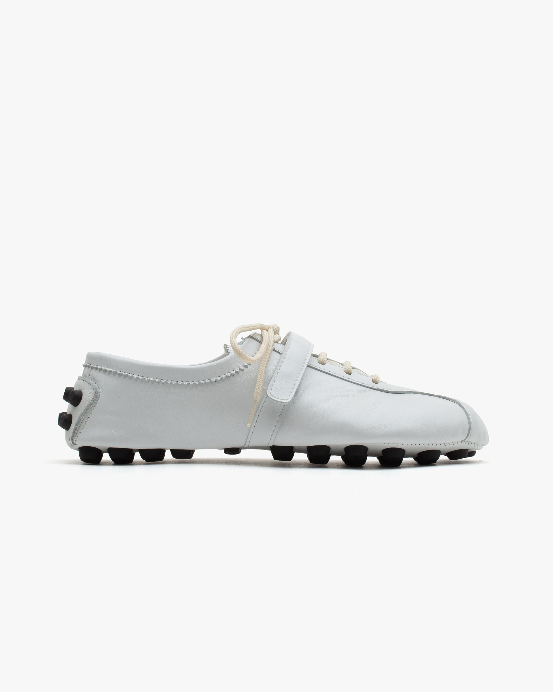 Ultra-soft glove construction sneaker with Velcro strap, padded tongue, padded ergonomic insole and double injection moulded sole with proprietary 7mm TPU “car shoe” studs. All Italian leather upper.