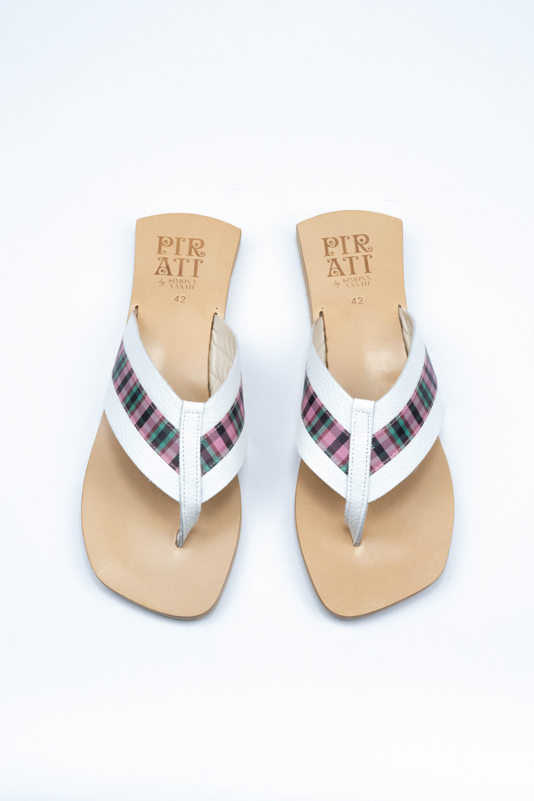 The classic oversized surfer hang-out thong, revisited through the Amalfi-tinged lens of Pirati and caprese sandal construction. Oversized, super-comfortable footband with printed acid tartan leather insert. Eva outsole for lighter over all weight and softer walk + our unique sole shape, a hybrid of influences from sports car detailing to the Arabian nights to gangster movies… Made in Amalfi Coast from 100% Italian materials and available in MENS and womens sizes.