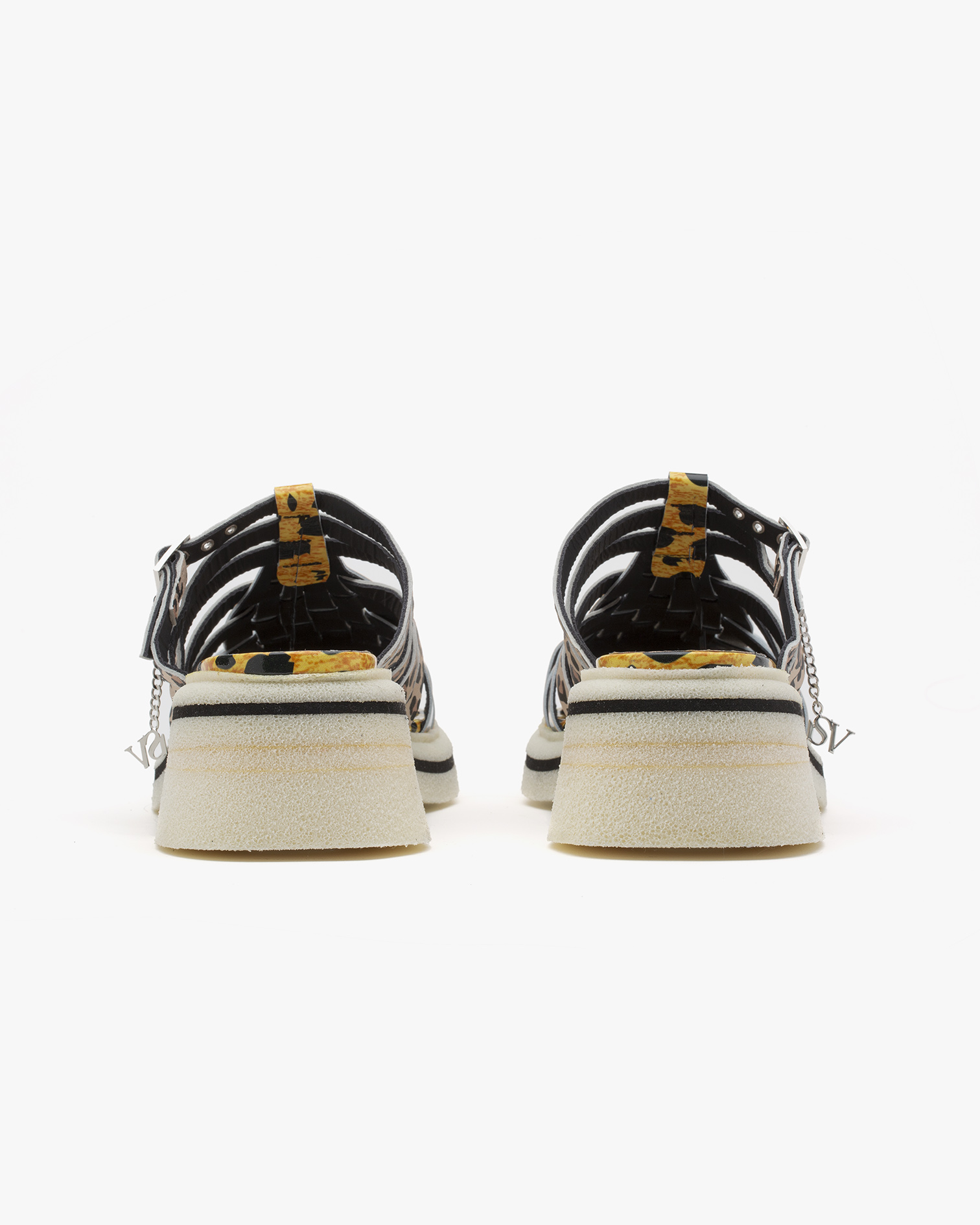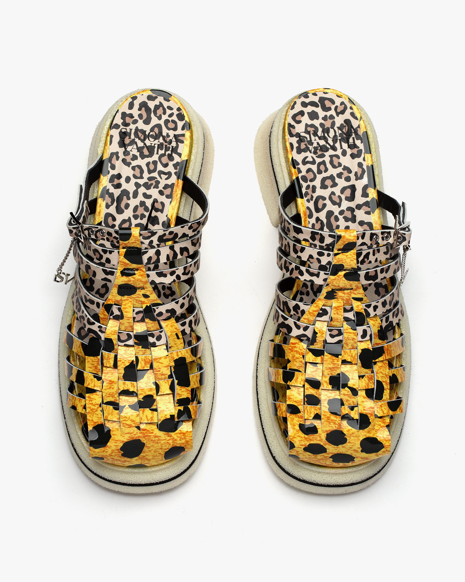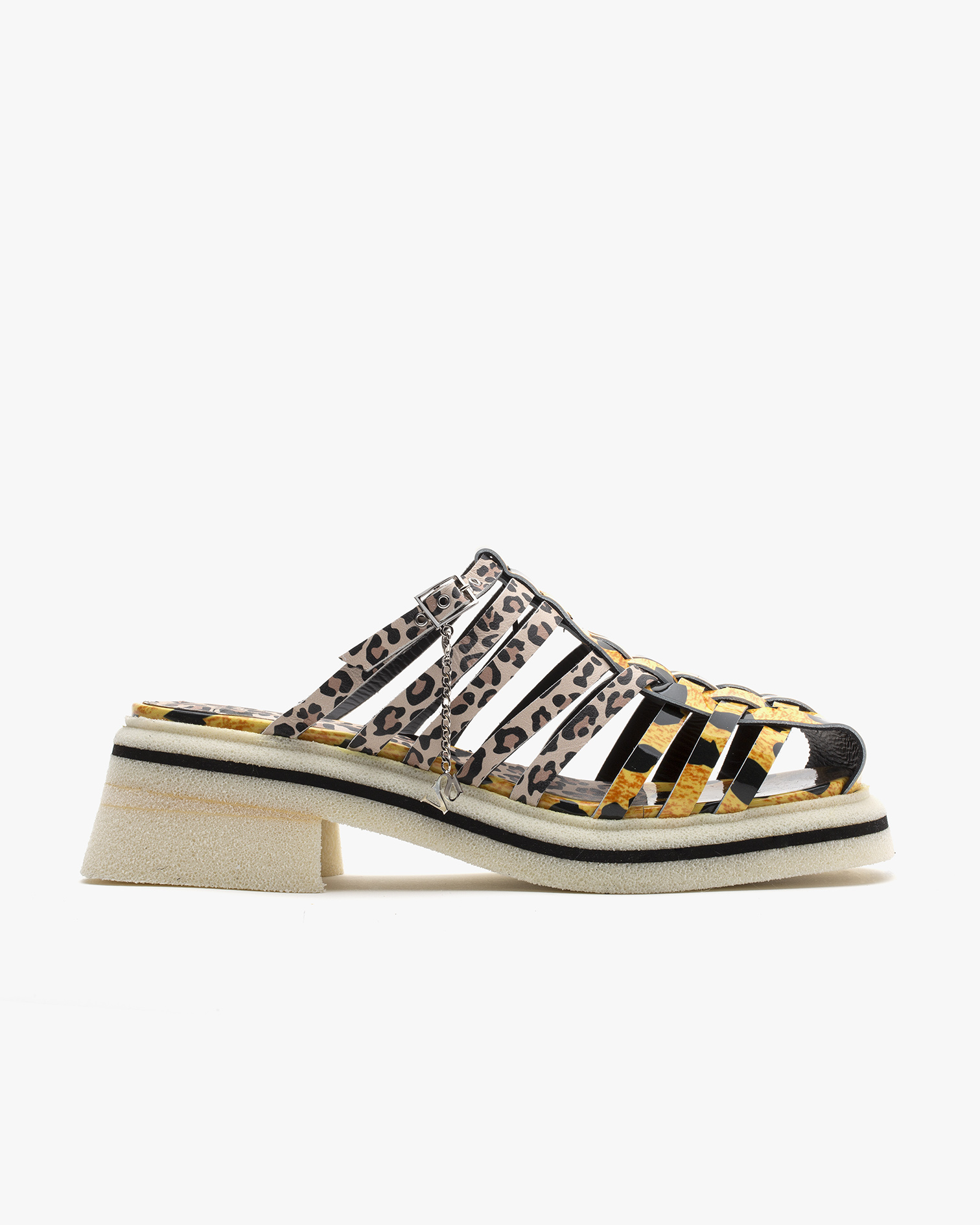 Murano Cheetah sabot is a new, Millenium Diva-mood, version of Simona Vanth’s Venetian fisherman sandal. In this case the sole remains identical, manufactured from one of our favourite materials, Super Crepe, a locally-made ultralight re-interpretation of traditional rubber crepe soles, with a traditional VenEtian navy pinstripe. The woven upper is made from a combination of two different leopard skin patterns, printed on premium Italian patent and napa leathers.     - Made in Italy - Locally-made ultralight EVA sole - Premium Italian patent and napa leather - Removable ankle SV charm