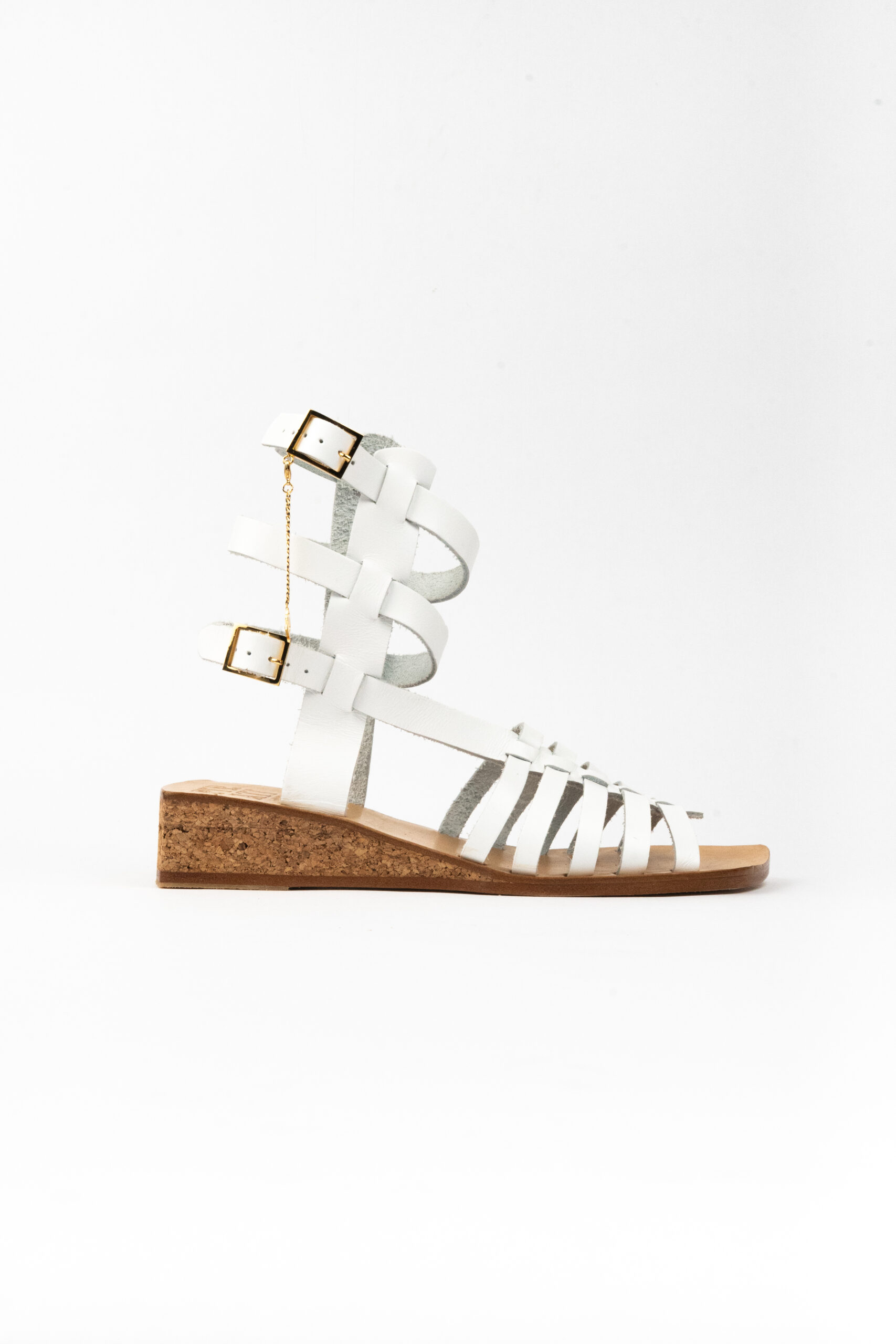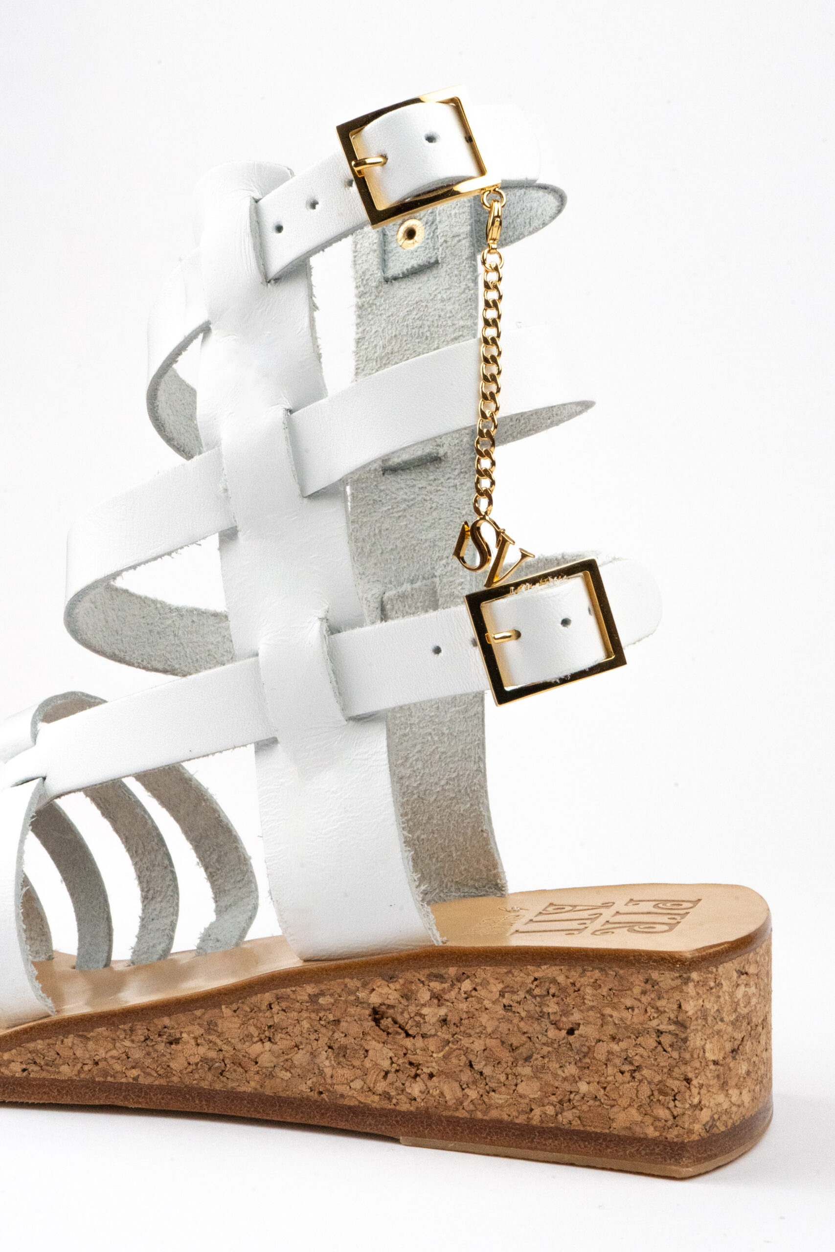 Gladiator sandals are a personal favourite that I continue to revisit whenever possible. With the wonderful and talented artisan who makes our Pirati I worked to create an entirely new style where all straps run on gently diagonal axes, accentuating the handmade nature of the sandal. Beautiful signature SV nickel-plated buckles, chain and pendant complete the sandal. Full eleather sole with rubber heel and 30mm natural cork wedge heel. As with all sandals in the Pirati range, the Punch features our unique sole shape, a hybrid of influences from sports car detailing to the Arabian nights to gangster movies… Made in Amalfi Coast from 100% Italian materials.